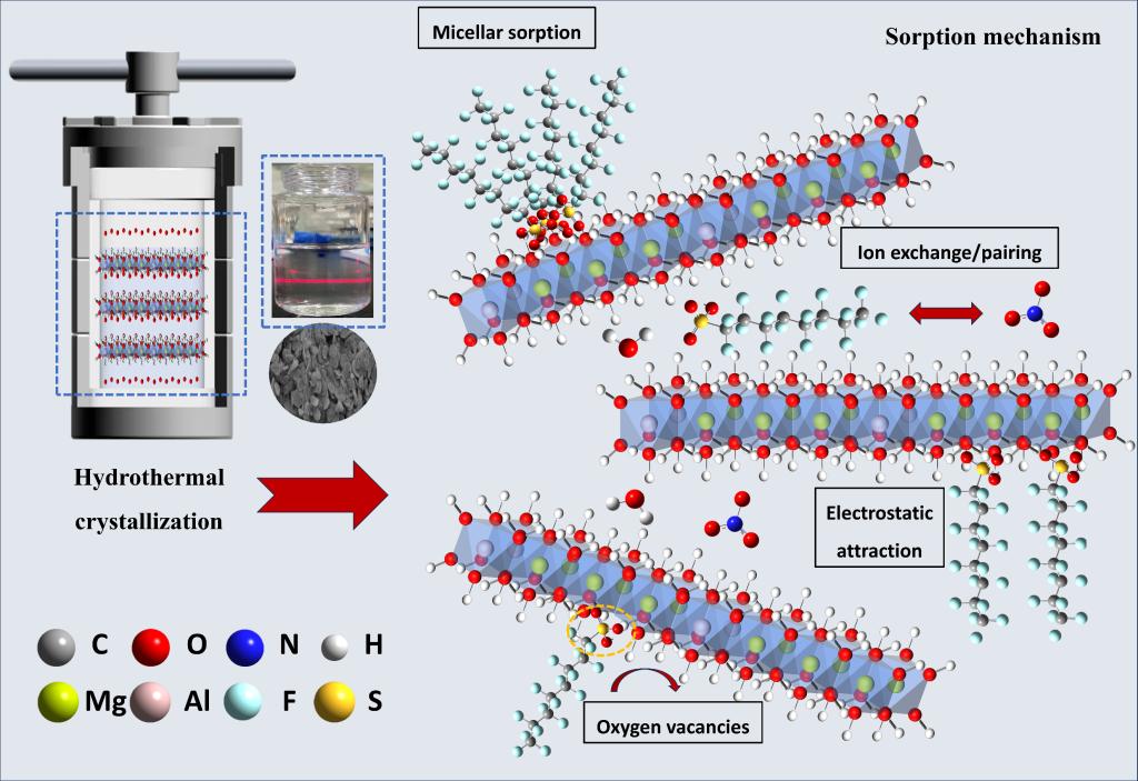 本研究针对LDHs处理水环境中全氟或多氟烷基物质(PFAS),存在同时处理多种PFAS效率低、易团聚等难题,提出了一种绿色低温热剥离法,成功制备了超薄MgAl-LDH纳米片(LDHNSs)并应用于PFAS去除。与常规LDHs相比,LDHNSs的吸附容量提高了82%。热剥离后,LDHNSs获得了更高的比表面积和更多的氧空位,从而显著增强了对PFOS的吸附能力。去除机理主要包括静电相互作用和离子交换等机制。此外,研究结果表明,LDHNSs能同时高效去除12种常见PFAS化合物,具有出色的再生性能。经过五轮循环使用后,LDHNSs仍能保持优异的去除效率。本研究为开发高效环保的PFAS修复材料提供了新思路,并为PFAS污染修复提供了理论依据。