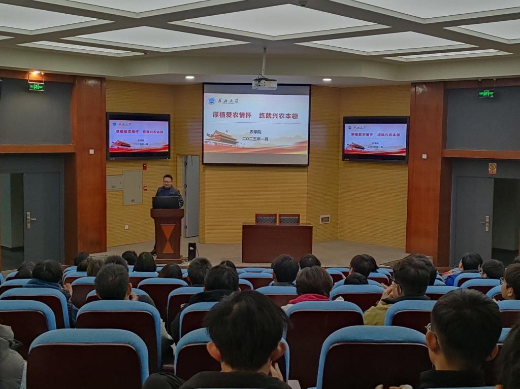 (通讯员 李佳怡)2025年1月2日晚六点半,正规滚球app平台官网于农科大楼1056报告厅举行一场面向2024级本科生的学农爱农宣讲报告会,旨在激发学生学农爱农的热情,为农业发展培育新生力量。正规滚球app平台官网副院长张运波、副书记尹小华及2024级全体本科生出席本次报告会,会议由尹小华主持。