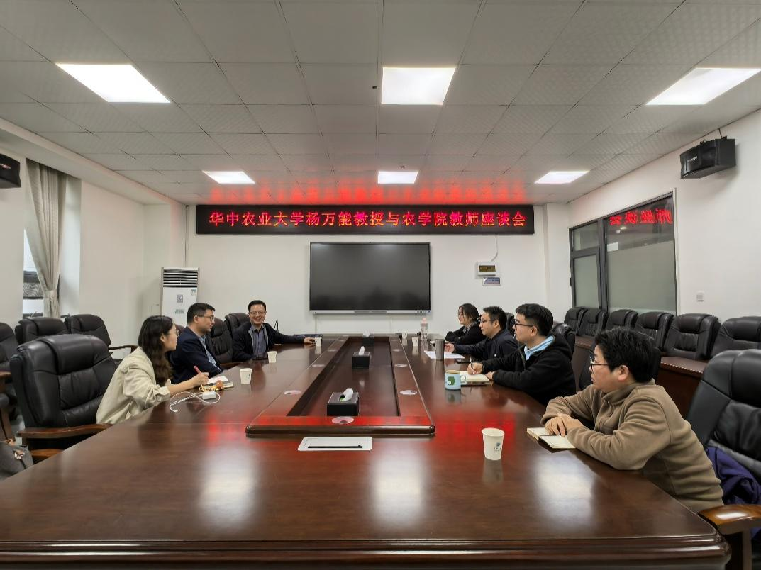 随后,杨万能教授与滚球app官网副院长张运波、院长助理兼农学系主任邓锋林,以及教师代表曾凡荣、覃元、朱相潜等人举行座谈。双方围绕 “作物表型平台设计与落地建设”“交叉学科教学科研团队组建与人员配置”“智慧农业方向培育与发展”“作物学一流学科内涵建设” 等关键议题深入交流,杨教授结合自身团队经验与行业前沿趋势,为滚球app官网学科专业建设、特色方向发展提供了兼具专业性与可操作性的指导建议。