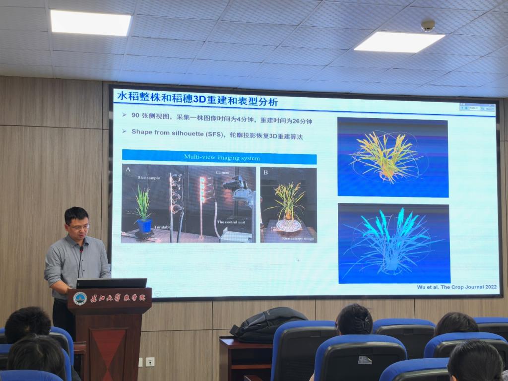 首先,杨万能教授为滚球app官网师生作题为“作物表型组学前沿技术研究与应用”的学术报告。在报告中,杨教授通过生动有趣的案例、通俗易懂的语言,详细介绍了其团队围绕作物性状表型数据“高通量、高质量、高效率”采集及分析目标,自主研发设备、编写程序的过程,同时分享了研发过程中遇到的技术瓶颈与创新解决思路;此外,还系统阐明了作物表型分析技术与基因组、代谢组等技术联合应用,进而挖掘作物关键功能基因的经典实践案例。报告结束后,杨教授与师生围绕“平台与传感器选择”“表型分析模型构建”等核心问题展开深入研讨,耐心解答师生疑问。此次报告有效开拓了师生学术视野,进一步激发了大家对农业信息技术、智慧农业等新兴领域的研究兴趣。