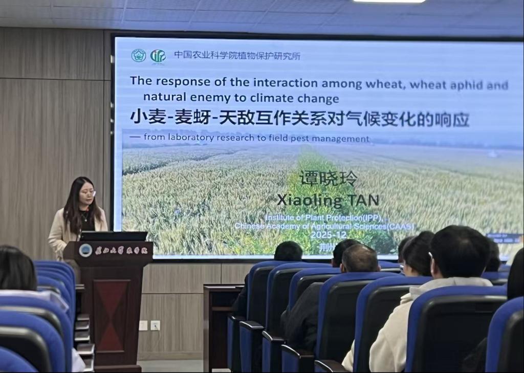谭晓玲本科毕业于正规滚球app平台官网植物保护专业,她结合近50年气温变化数据和极端天气案例,揭示气候变暖对农业生态系统的显著冲击效应及机制,深入剖析了跨纬度麦田系统中“小麦-蚜虫-天敌”不同营养级对气候变暖的响应机制,既从“自下而上”和“自上而下”双路径解读了气候变暖影响蚜虫暴发的内在逻辑,也揭示了变暖加剧麦蚜生态位竞争、诱发次生害虫暴发的新风险。在技术应用环节,她分享了集成的“推-拉-杀”绿色控害方案,实现了麦蚜种群减少30%-50%、农药用量降低超40%的成效。