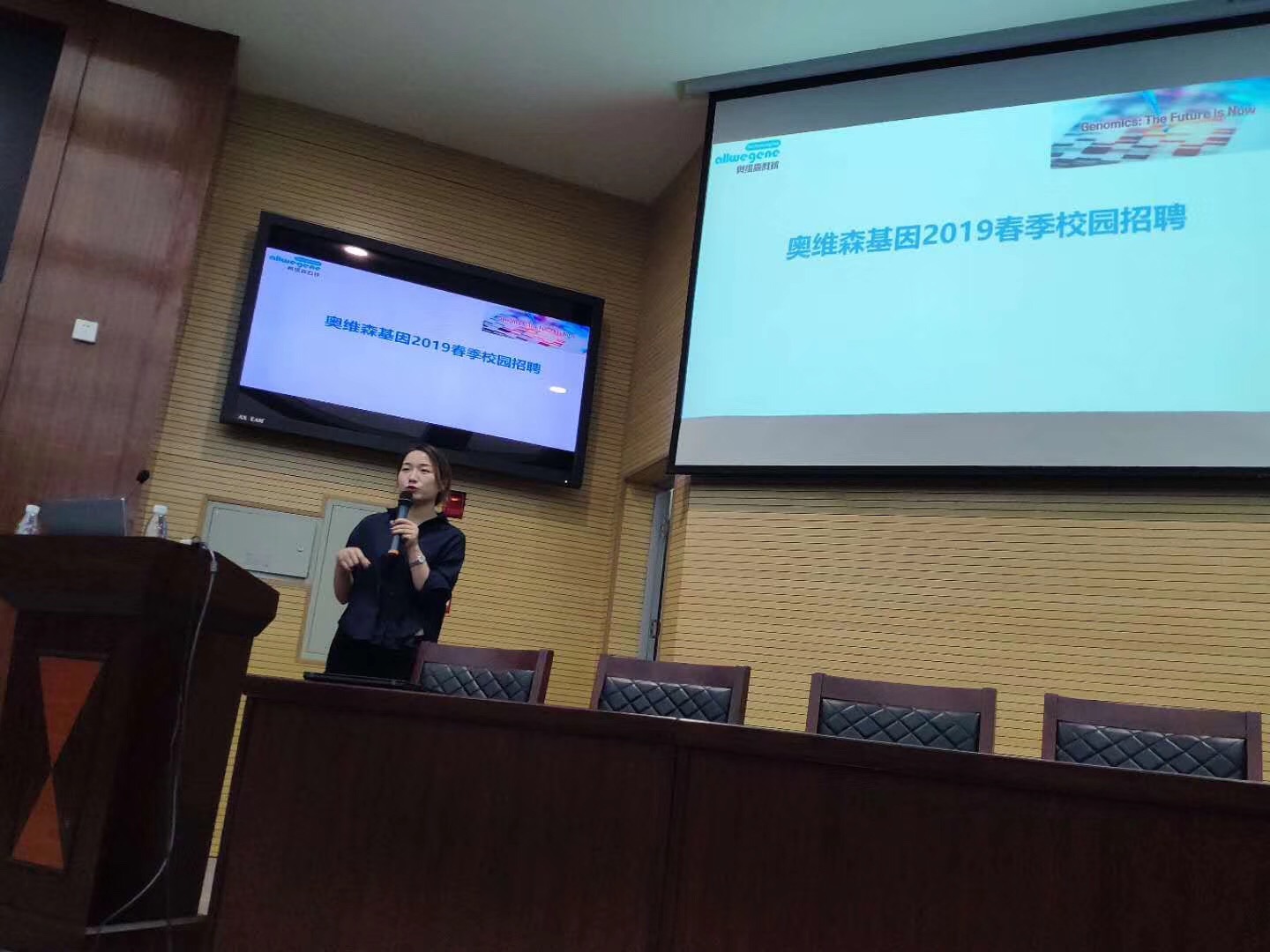 宣讲会上,各个企业代表依次登台,宣讲本单位的历史与文化、目前的市场状况、未来的经营规划等。来自北京奥维森基因科技股份有限公司的代表刘莎介绍道:“农学是目前最有前景的专业之一,基因科技与农产品的研发息息相关。我仅代表公司,向在座诸位发出邀请,期待每一位农科学子的加入!”接着,与会同学手持精心准备的简历,和心仪企业的负责人一对一交流,了解与就业相关的具体信息。