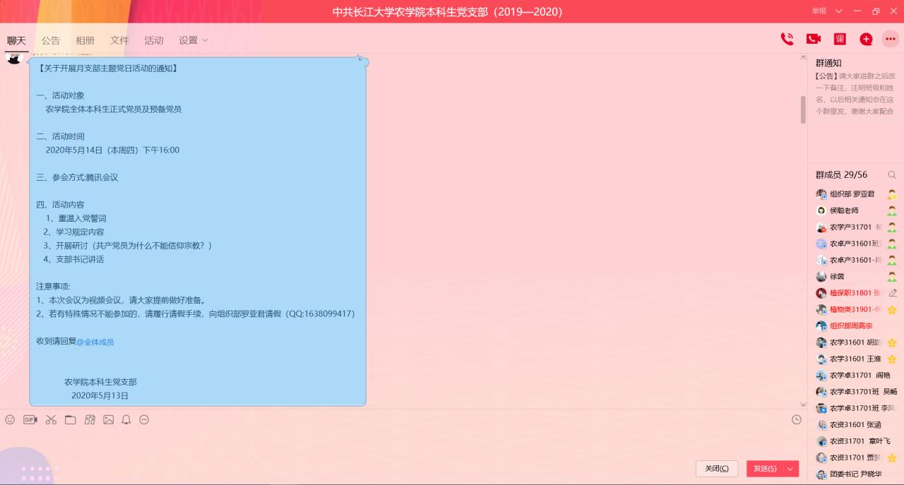 通讯社讯(学生记者 张毅)为引导广大党员用马克思主义立场、观点、方法认识和对待宗教,坚定共产主义信仰和中国特色社会主义信念,滚球app官网本科生党支部于5月14日16:00通过QQ群视频通话的方式开展了线上支部主题党日活动。此次活动由正规滚球app平台官网本科生党支部宣传委员杨欧主持,全体本科生正式党员以及预备党员参与此次活动。