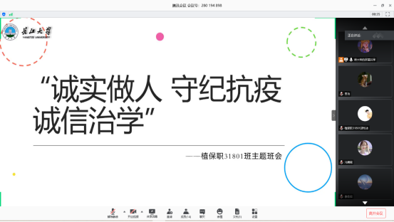 本次主题教育活动紧密围绕“做人、抗疫、治学”等大学生事务,将“诚信”理念贯穿其中,引发各班级的纷纷响应和热烈讨论。植物类31902班通过“腾讯会议”平台开展了此次班会。班长亢凯同学在会前召集了全班学生,并邀请班主任邓锋林老师参会。会上,主讲人李麟政给同学们普及了生源地助学贷款的相关事宜,讲解了疫情期间的防护措施和需要注意的问题,并着重强调了诚信的作用。活动中,每个同学都积极认真地参与进来,表现出了对诚信问题的高度关注,希望能做诚实之人、守纪之人。植保职31801班也积极参与到了主题活动中。首先由主持人杨姝祺同学说明此次活动背景,并播放教育部考试中心录制的《教育部诚信考试宣传片》。该视频以青蛙为角色,学校为背景,生动形象地阐述了违纪作弊、违法考试的处理方式。最后,同学们积极交流自己的观影感想,罗亚君同学感慨道:“我们要以视频为本延伸至每一次考试,目前临近期末,希望大家都能认真复习,以诚信、自身实力考出不俗的成绩。”