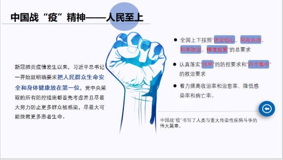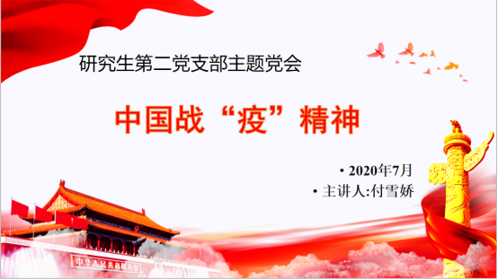 会议中,支部书记付雪娇同志以“中国战疫精神—宝贵的精神财富”为主题讲授了一堂微党课,从人民至上、信心如磐、指挥若定、一呼百应、敏捷高效、逆行奉献、科学精准和守望相助等八个角度阐述了中国战“疫”精神的内涵,并号召及要求大家要把这种战“疫”精神注入到实现中华民族伟大复兴的征途中,让其转化为巨大的物质力量。其他党员同志就微党课内容精神纷纷发言:需加倍珍惜这来之不易的健康稳定的生活环境,并表示会以饱满的精神状态投入到即将开始的科研学习和生活中。