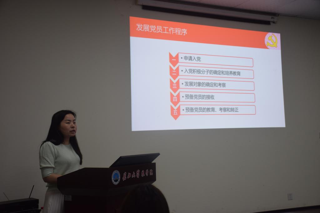 会议伊始,侯聪老师围绕“申请入党” “入党积极分子的确定和培养教育”以及“发展对象的确定和考察”三个方面为参会人员进行了详细讲解。她指出,作为青年大学生,必须明确自己身上所肩负的责任,勇于担当新使命,不懈奋斗,努力争取成长为一名合格的共产党员。接着,她又从“预备党员的接收”和“预备党员的教育考察和转正”两方面鼓励同学们加入中国共产党,践行自己的人生理想,把有限的生命投入无限的为人民服务中去。然后,侯聪老师为大家指出以往推优工作中存在的问题,她告诉同学们党员发展是一项长期的工作,在被发展前有许多问题需要注意。