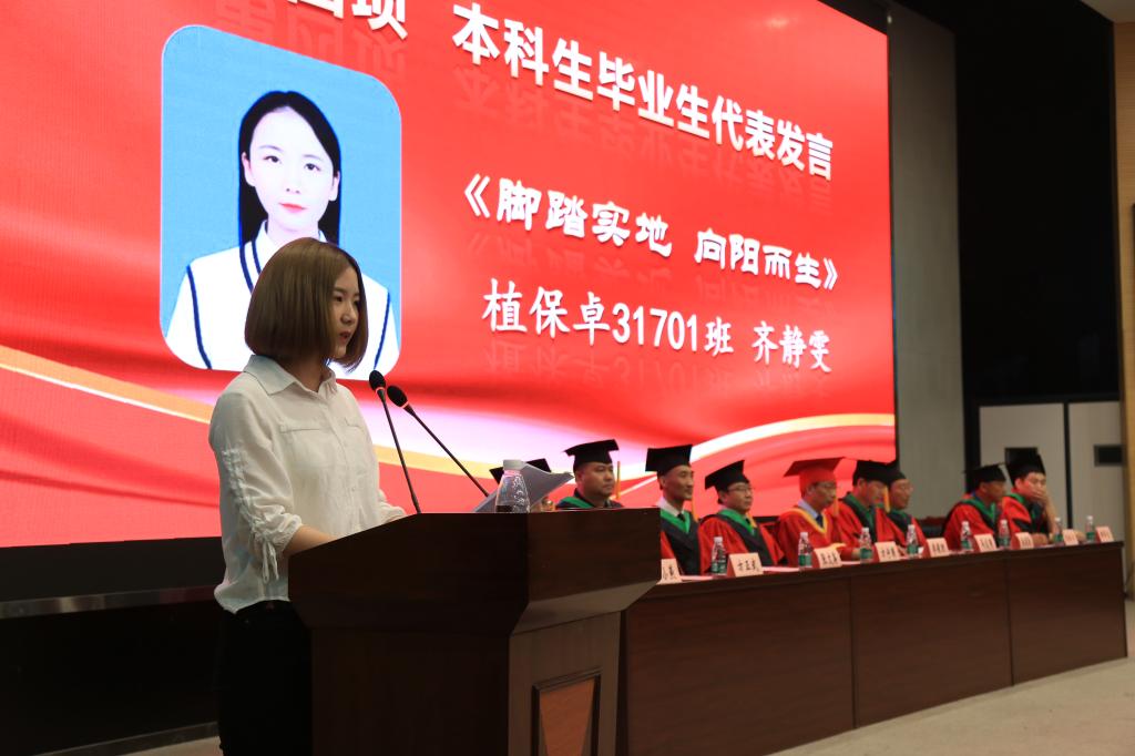 本科生毕业生代表齐静雯、研究生毕业生代表郭凯先后上台发言,分享了在校期间的学习经历、科研经历、成长经历,对老师、同学表达了感激之情,对未来的发展进行了展望。