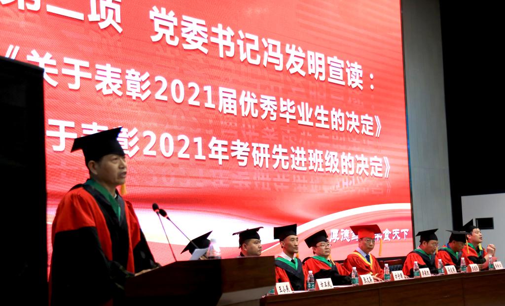 仪式在庄严的国歌声中揭开了序幕。党委书记冯发明宣读了《关于表彰2021届优秀毕业生的决定》、《关于表彰2021年考研先进班级的决定》。华强化工集团党委副书记王建波为优秀毕业生颁奖,正规滚球app平台官网行政副院长邵四海为考研先进班级颁奖。