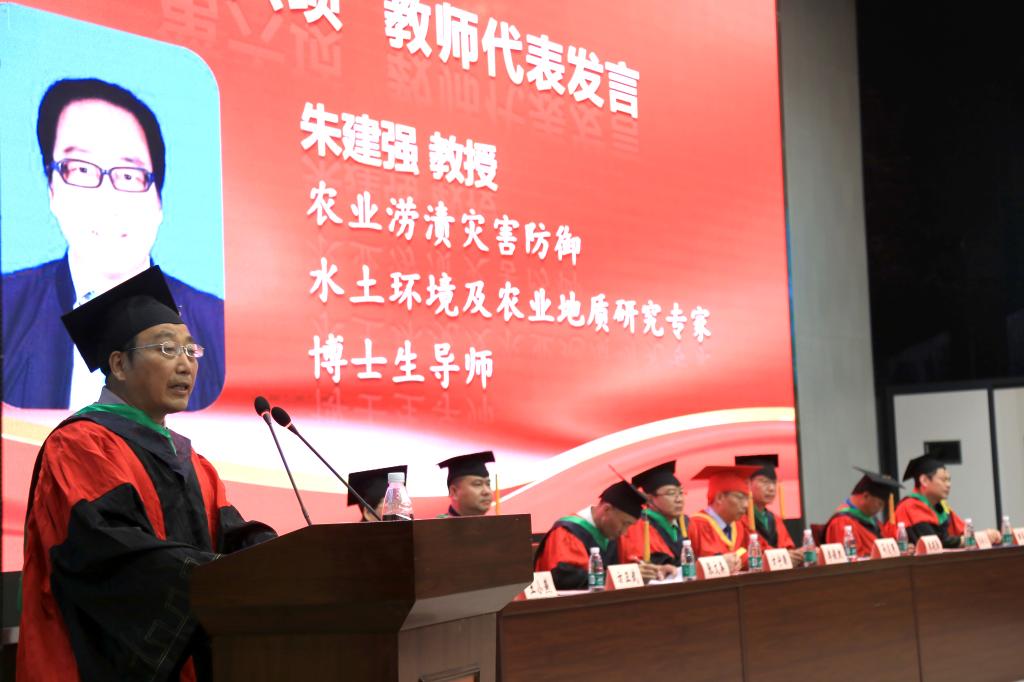 教师代表朱建强教授分享了自己研究国学的体会,希望同学们用好专业知识,争取成为“下得去、用得上、干得好、留得住、上得来”的优秀校友。