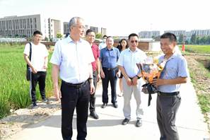 在水稻试验田,李志新教授正在太阳底下忙碌着。校长冯征来到田间,向他献花,并现场仔细了解其研究成果,向他表示祝贺,并鼓励他继续“把论文写在祖国的大地上”。