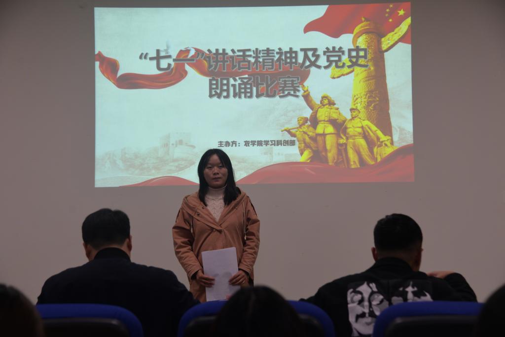 通讯社讯(见习记者 李慧明/文 李雨珈 姚攀/摄)为了更好地学习习近平总书记“七一”重要讲话精神,让同学们深入了解党史,培养同学们的语言表达能力,滚球app官网于11月19日晚在农科大楼3073报告厅开展“七一”讲话精神诗歌朗诵比赛。此次比赛由正规滚球app平台官网学习科创部主办,陈雨涵和杨孟林两名同学主持。学工办主任刘庆、分团委书记侯聪、辅导员付雪娇、兼职辅导员杨成杰出席并担任本次比赛评委。