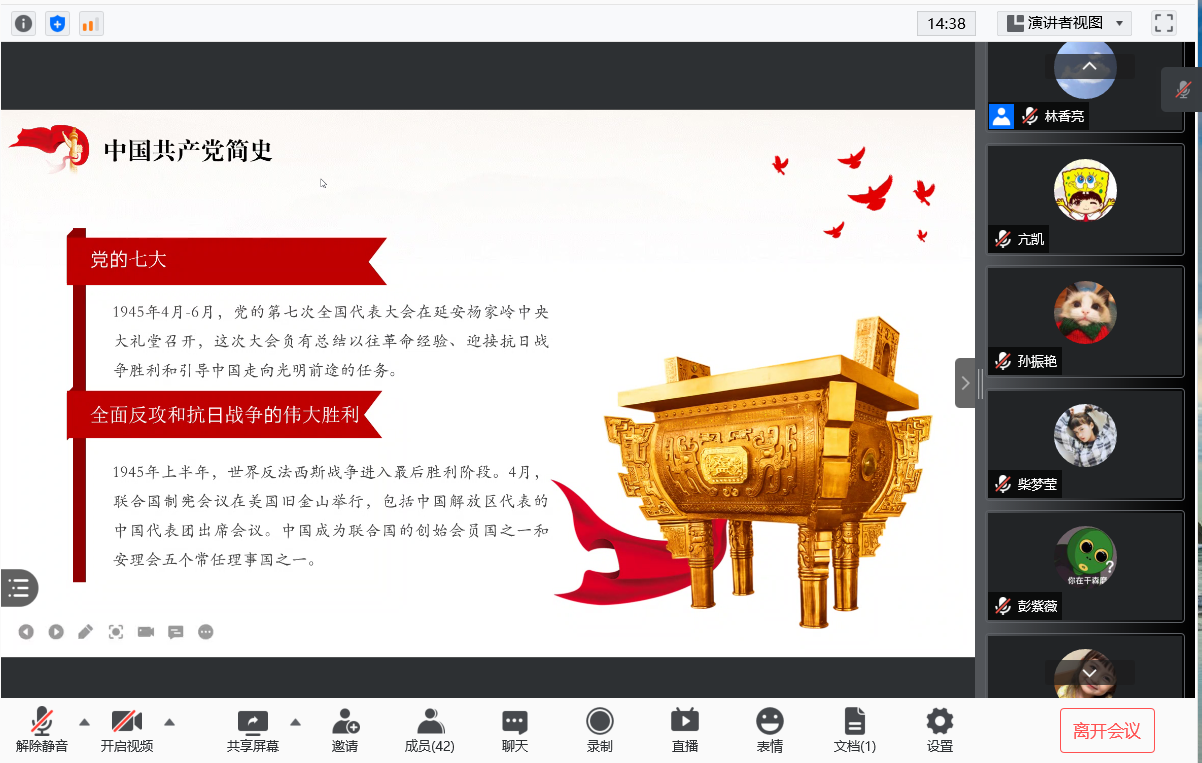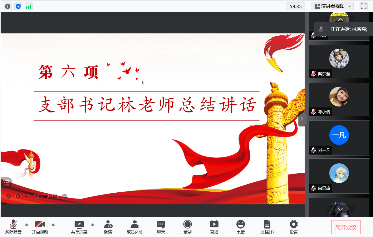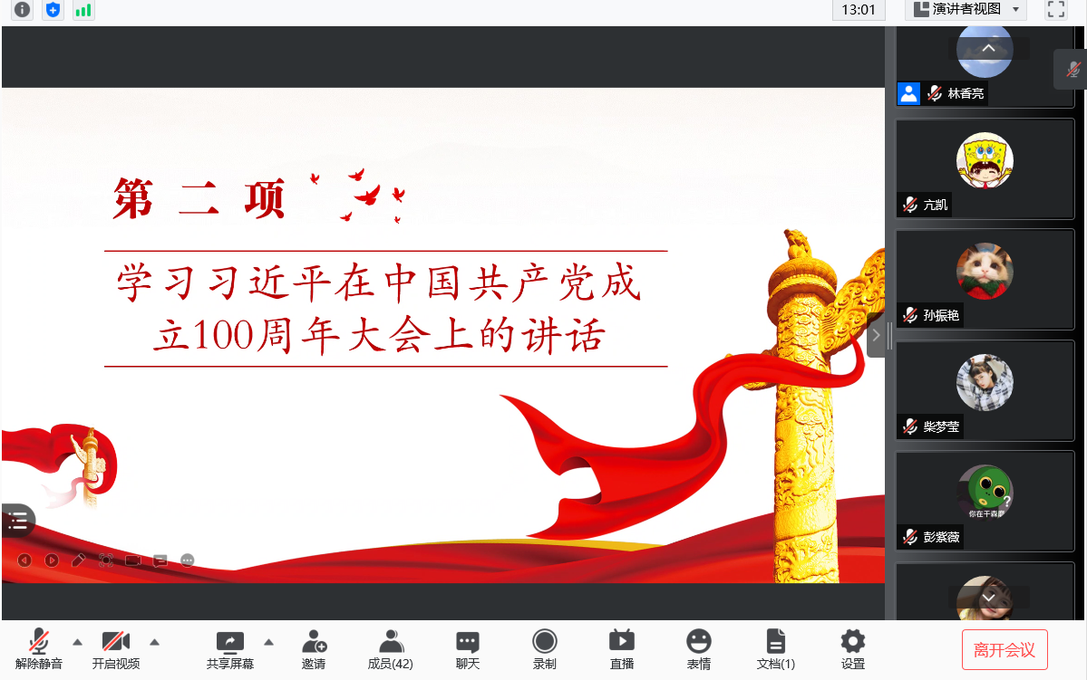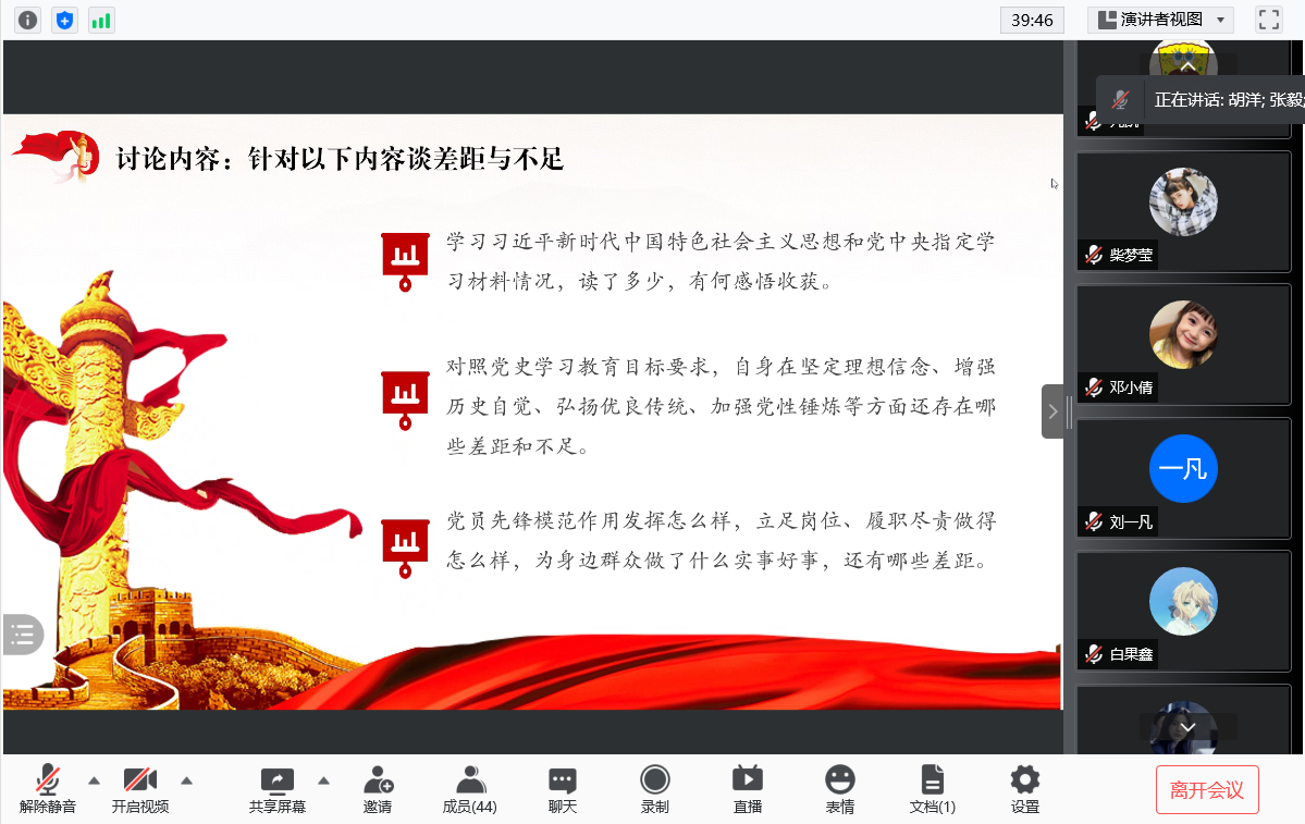 会议伊始,首先由主持人唐海洋同志领读入党誓词,接着分别由牟春霓同志介绍学习习近平总书记在庆祝中国共产党成立100周年大会上的重要讲话、张大弘同志介绍学习《中国共产党简史》中的指定内容“党的七大”和“全面反攻和抗日战争的伟大胜利”。介绍的同志介绍得很详细认真,其余得同志听得也挺认真,并在会议进行第四项时,积极发言谈了自己的学习感悟。