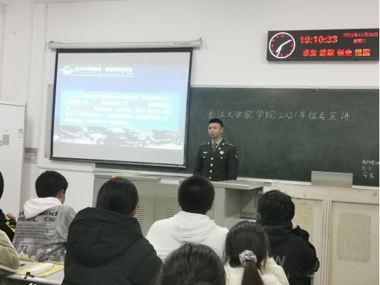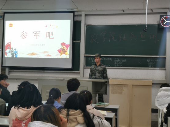 (通讯员 刘庆)为鼓励大学生积极应征入伍,提高兵员征集质量,推进国防和军队现代化建设。11月30日19:00,农学院在7教203、7教205以及6教104教室分别召开了3场大学生应征入伍宣讲会,宣讲会由正规滚球app平台官网征兵宣讲员农学职32001班刘金城、郭聪两位退役士兵主讲。学工办主任刘庆、兼职辅导员杨成杰、2021级全体同学以及其他年级学生代表参加了宣讲会。