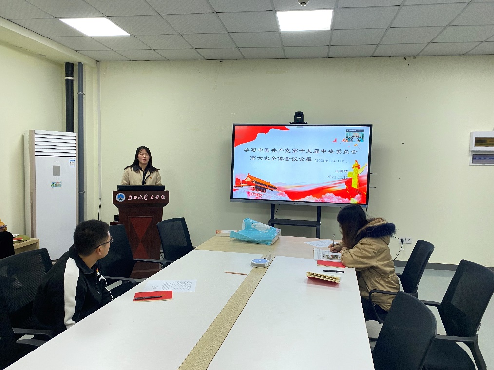 会议最后,支部书记付雪娇同志作总结发言,指出所有党员在学习贯彻党的十九届六中全会精神过程中,要从党的奋斗历程和伟大成就中鼓舞斗志,明确方向;从党的百年历史经验中汲取智慧和力量,始终铭记过去,自觉践行初心使命,增强四个意识、坚定四个自信、维护两个确立,把思想和行动统一到党的十九届六中全会精神上来,并提出,作为研究生党员,要牢牢握紧新时代的接力棒,用更加昂扬的姿态迎接挑战,攻克各种难关,做好、坐稳新时代接班人。