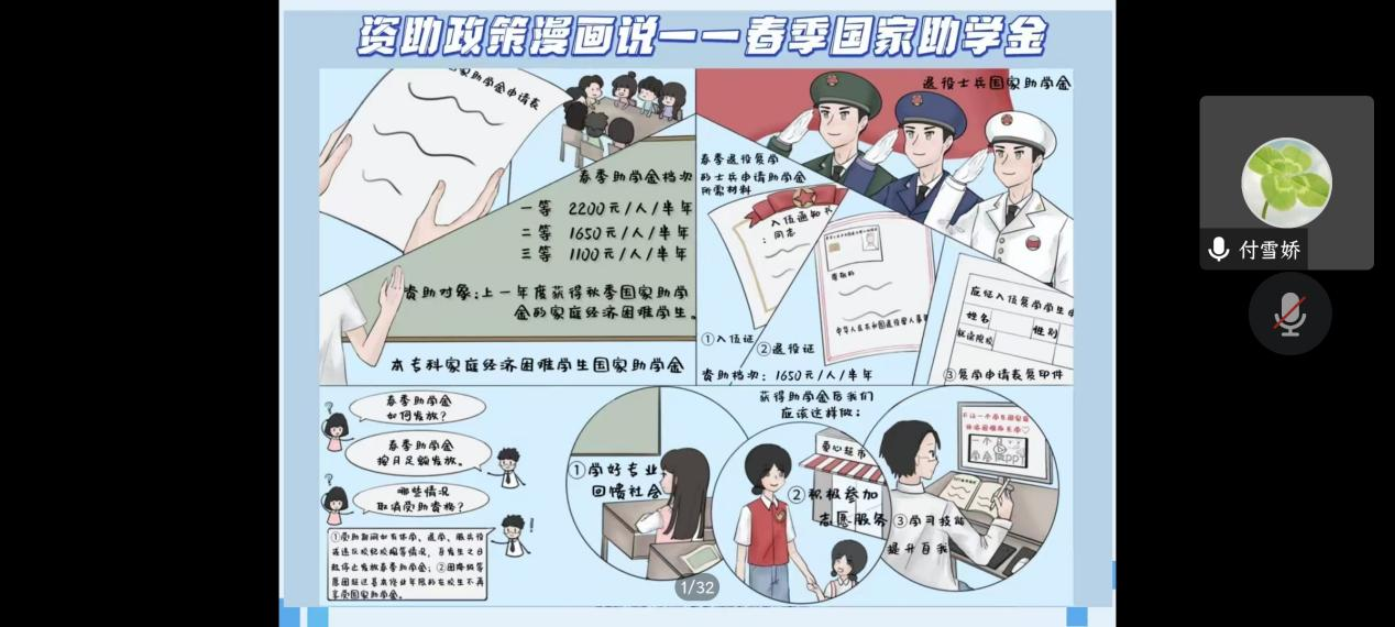 本次培训中,付雪娇老师从资助概况、资助重点、资助流程、资助要点四个方面进行了详细的讲解,对各类奖助学金的评选要求和操作流程做了详细的解释,期间并用漫画的形式对春季国家助学金进行了生动形象的描绘。除此之外,付雪娇老师还重点讲述了国家助学贷款的相关事项,强调了学生关注还款方式的重要性。