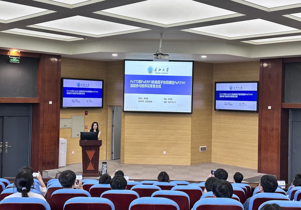 随后,8位主讲人依次登台,结合自身研究领域,带来了一场场精彩纷呈的学术分享。正规滚球app平台官网硕士研究生罗旖柔在前期对于两种不同花色甜荞转录组学研究的基础上,克隆出与甜荞花青素合成相关的候选基因FeTT2。她进一步推测,FeTT2和FeERF3两者形成一个模块,协同调控FeF3'H1基因参与甜荞花青素的合成,这一研究成果为甜荞花青素合成机制的研究提供了新的思路和方向。正规滚球app平台官网硕士研究生何锋则聚焦于秸秆还田下的稻田种植模式,探讨了6种不同种植模式在秸秆还田条件下对温室气体排放的影响以及与环境因素之间的复杂关系,为农业可持续发展提供了重要的数据支持和理论依据。