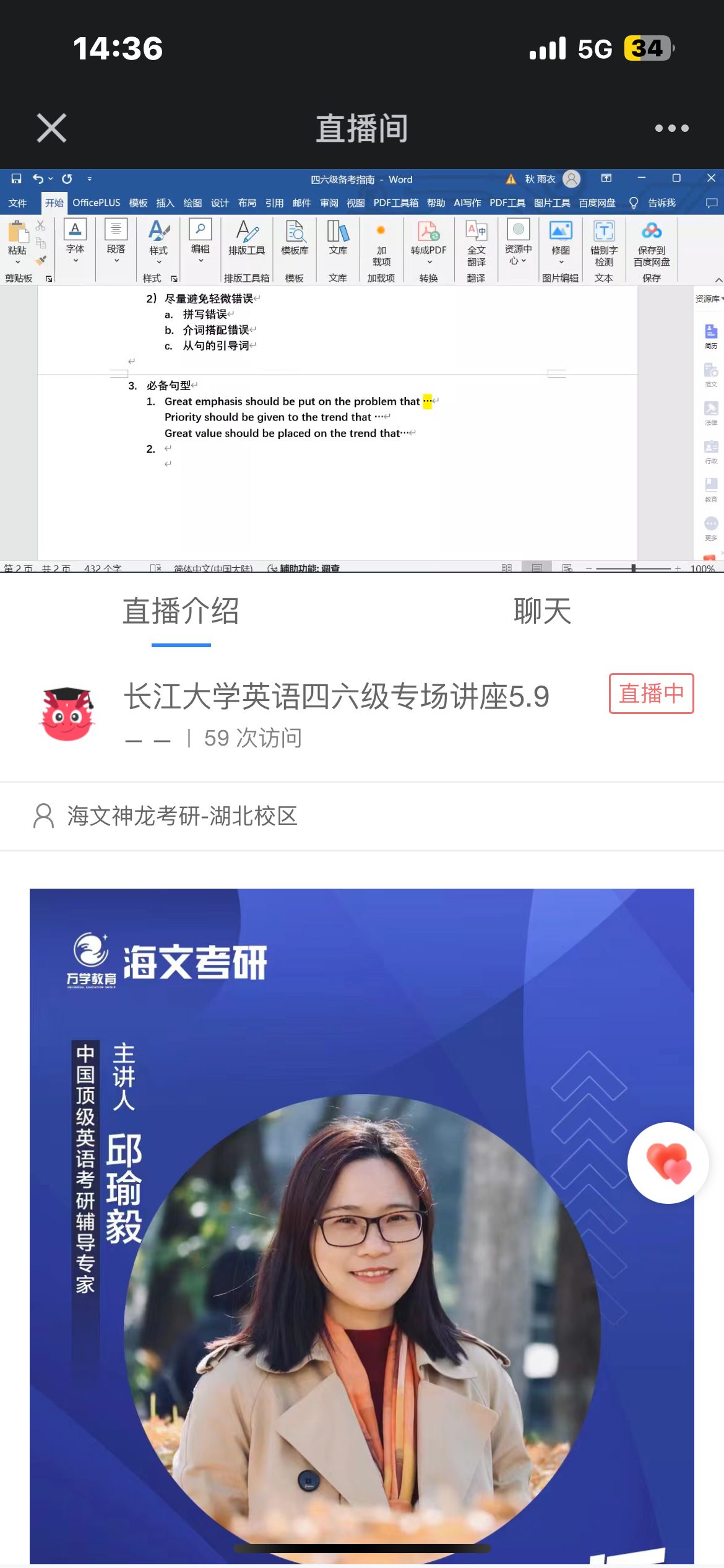 (通讯员 杨梦瑶)为激发滚球app官网学子对英语的学习兴趣,丰富知识储备,提高英语素养,分享英语学习经验,为备考英语等级考试筑牢基础,近日,滚球app官网于2024年5月10日线上开展“英语四六级”主题讲座,此次讲座由中国顶级考研英语辅导专家邱瑜毅主讲。