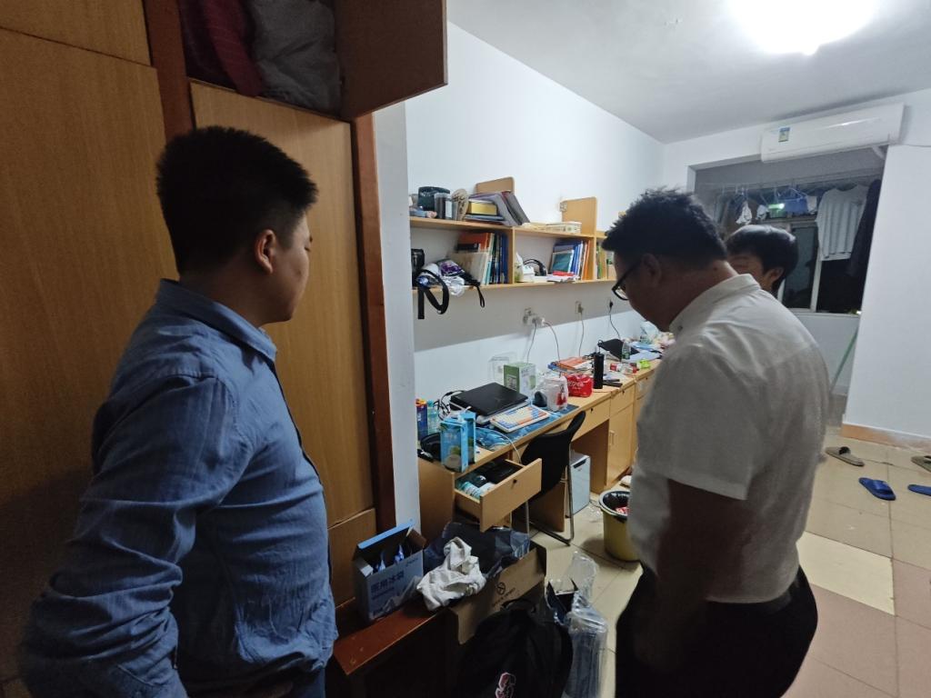(通讯员 王浩东)为进一步加强学生宿舍管理,规范学生行为,营造一个干净、整洁、和谐的生活学习环境,正规滚球app平台官网党委副书记尹小华老师、学工办主任黄承石老师、正规滚球app平台官网分团委书记付雪娇老师和辅导员唐玉婷于10月8日晚上突击检查学生宿舍,并借此机会与学生进行深入交流,探讨学习、生活、考研等多方面的问题。