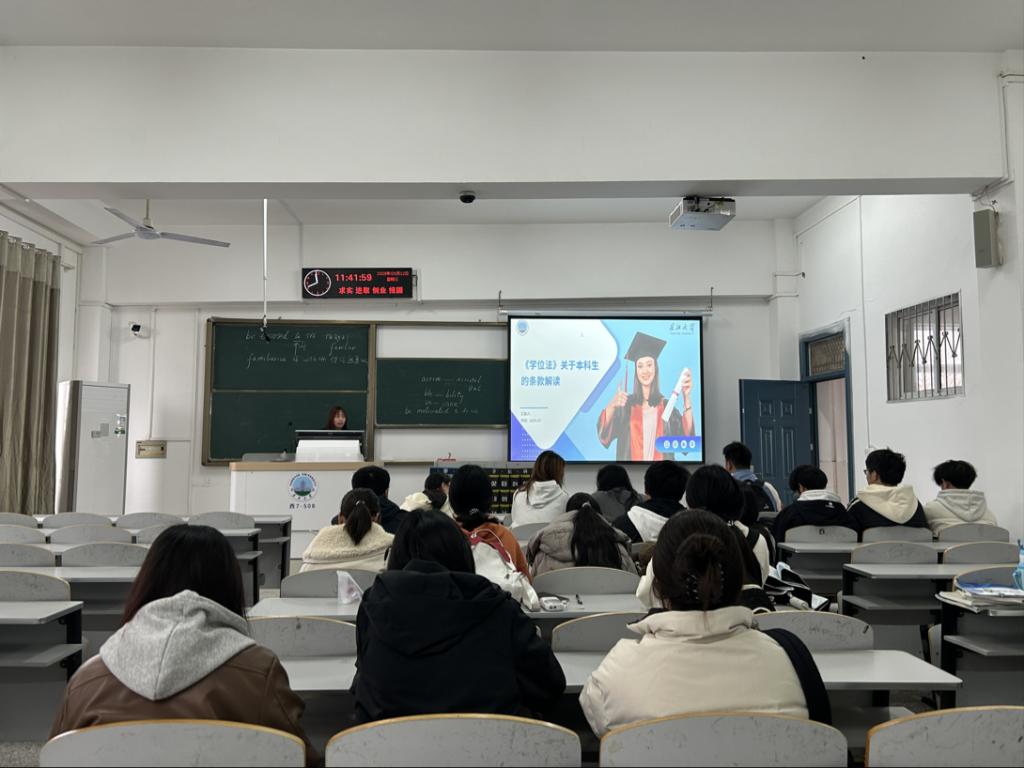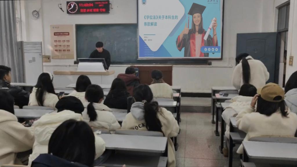 在各班级班会学习活动中,学工办主任黄承石提前录制引导视频,着重强调学位法对规范学位授予、保障学术质量的关键作用,指出其“是维护教育教学秩序、推动学术发展的重要法律依据”,为同学们提供学习指引。各班班委带领同学详细解读学位申请条件、授予程序、学术不端处理等核心条款,涵盖学位申请条件、授予程序、学术不端处理等内容,并结合校内实际发生的案例进行深入浅出的分析,帮助同学们更好地理解。