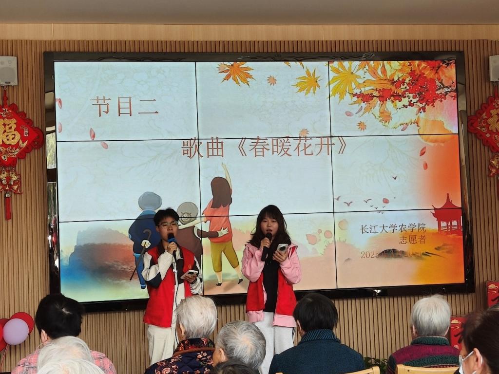 当天下午,敬老院前厅充满了欢声笑语。志愿者们为老人精心编排的节目在歌曲《春暖花开》中拉开序幕,他们随着旋律轻轻哼唱,脸上洋溢着幸福的笑容,欢快的歌舞《桃花朵朵开》、手势舞《外婆的澎湖湾》展现出青春的朝气与活力,赢得了老人们热烈的掌声,现场气氛达到高潮,最后,随着朗诵《出师表》最后一句“今当远离,临表涕零,不知所言”的落下,今天的志愿活动迎来了尾声。