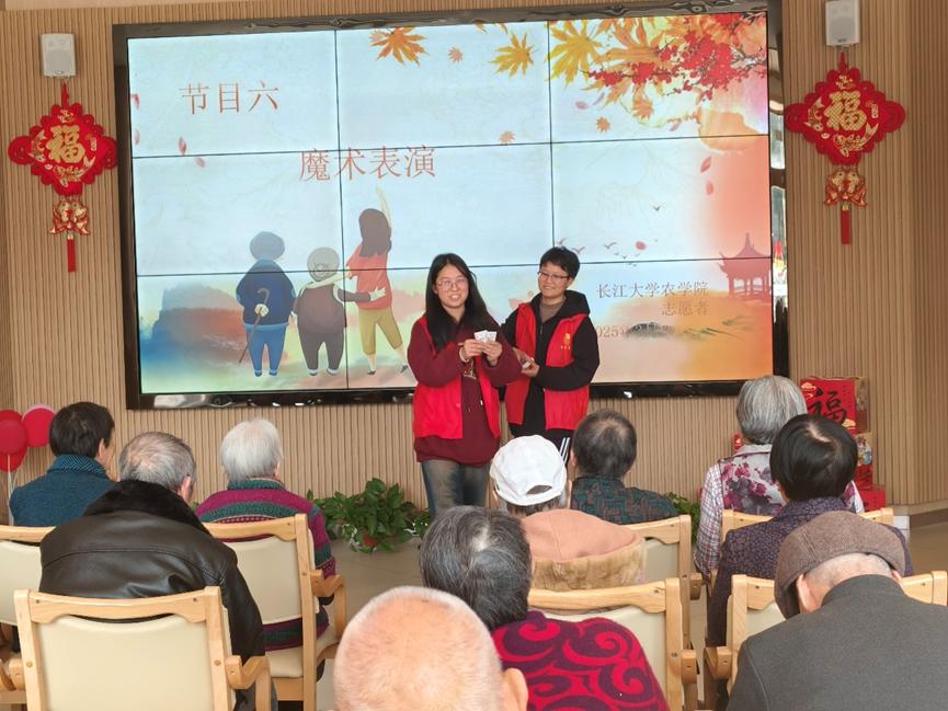 紧接着,魔术表演将活动推向了高潮。三位志愿者轮番上阵,以精巧的手法、奇幻的表演,让老人们惊叹不已,掌声与欢呼声此起彼伏,将现场氛围推向了顶点。