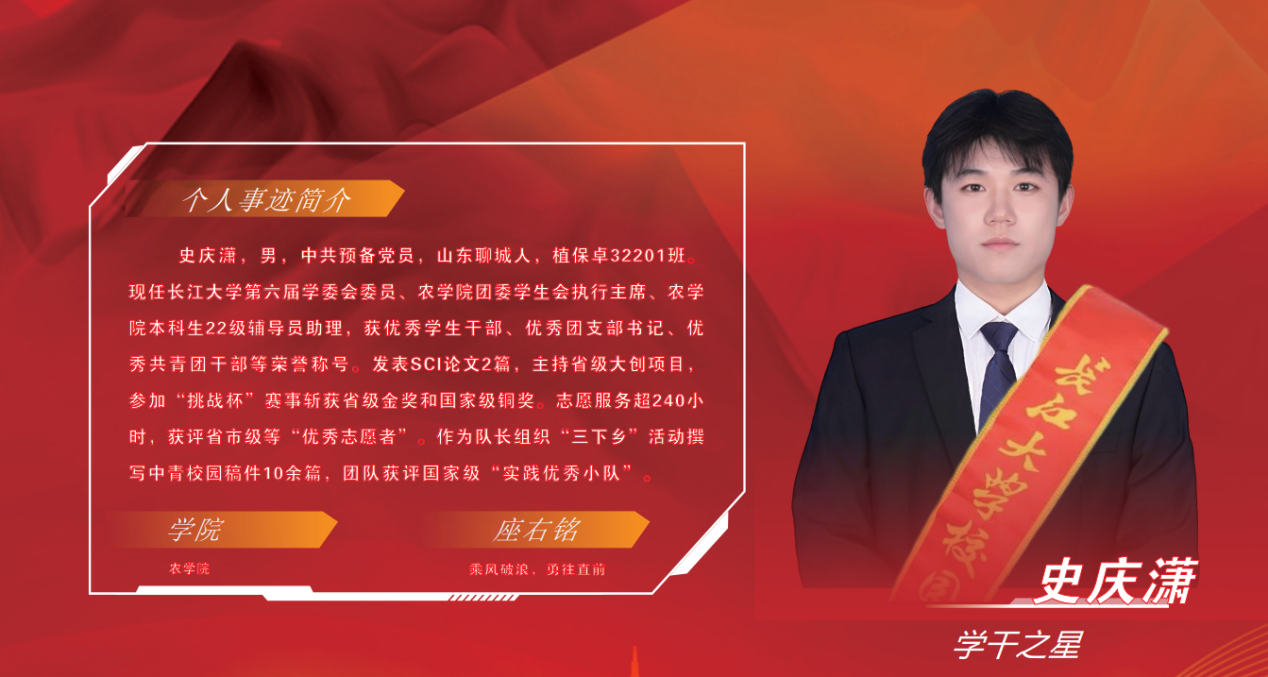 史庆潇,男,中共预备党员,山东聊城人,植保卓32201班学生。