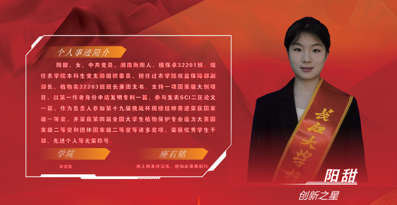 阳甜,女,中共党员,湖南衡阳人,植保卓32201班学生。