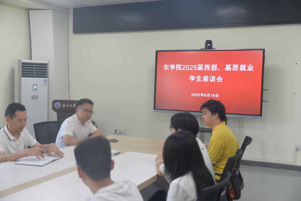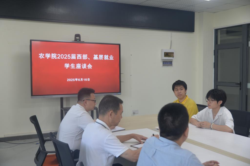 与会毕业生代表围绕基层就业的认知与规划展开深入交流,从专业应用、职业发展、社会价值等维度分享对西部基层工作的思考。他们表示,将以学院人才培养体系中积淀的实践能力为基,在农技推广、乡村治理、产业帮扶等岗位中践行农学使命,将课堂所学转化为服务乡村振兴的具体行动。周锦华认真听取发言后强调,基层工作虽需直面挑战,却是丈量人生价值的重要标尺,唯有扎根土地方能读懂农业发展脉搏,鼓励学子以院训精神为引领,在边疆基层书写新时代青年的责任担当。