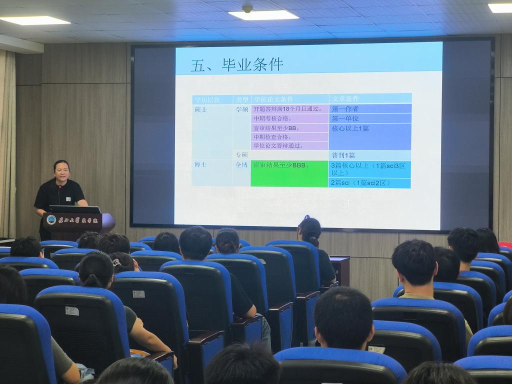 研究生教育与学科建设办公室主任杜亚楠和教学秘书雷翠玉聚焦学术领域,分别就学科建设、师资力量、培养方案、学术规范与导学关系等主题进行系统阐释,鼓励新生树立远大科研志向,筑牢专业根基,恪守学术道德,积极融入科研团队,勇攀科学高峰。