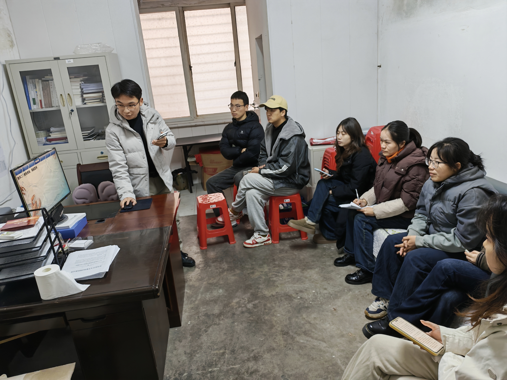 会议分为项目答辩交流与备赛要点指导两个环节。在第一环节中,三个项目的答辩成员依次进行了限时6分钟的项目陈述,每位同学答辩结束后,付雪娇首先进行针对性点评,其他与会成员也积极补充意见。付雪娇在肯定“青芥盾甲”项目其整体较为成熟的同时,提醒其完善专利论文材料并加强答辩时间的精准控制;对于“虾口常开”项目,指出其PPT背景略显杂乱、文字内容过多、重点不够突出等问题,建议优化视觉呈现,做到简洁清晰;关于豆粕项目,则建议统一字体颜色、突出关键数据与图片信息,以提升展示效果。