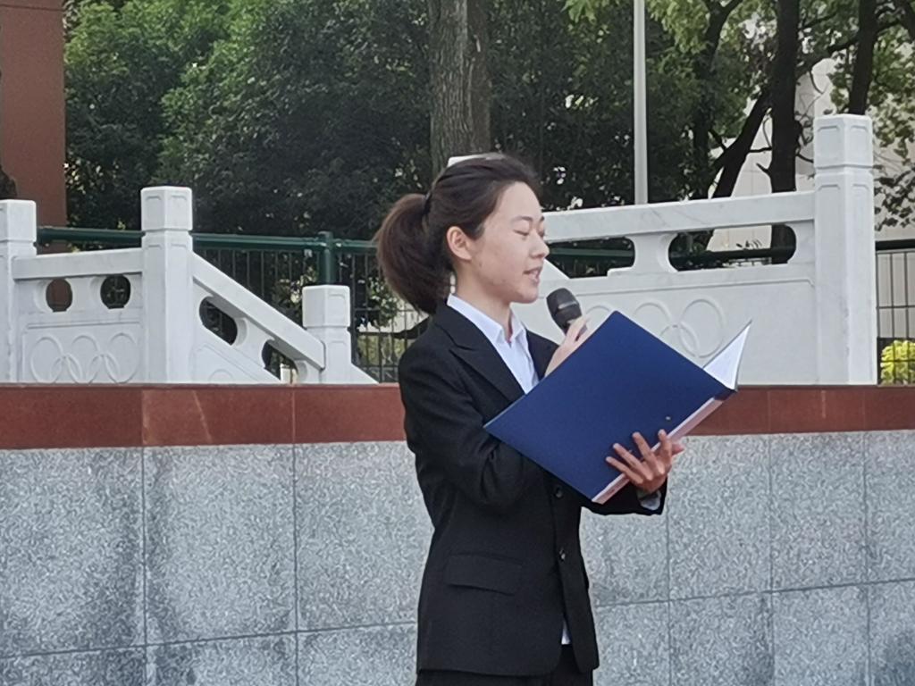 伴随着振奋人心的国歌响起,国旗护卫队踏着整齐响亮的步伐出旗,他们的庄严令人肃然起敬。全场师生齐唱国歌,向国旗行瞩目礼。
