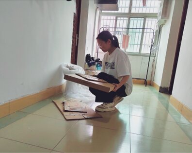 学校内的包装盒无形中堆满了各个角落,志愿者们认真地将它们进行了回收,再将回收的包装盒集中处理,绿色环保。