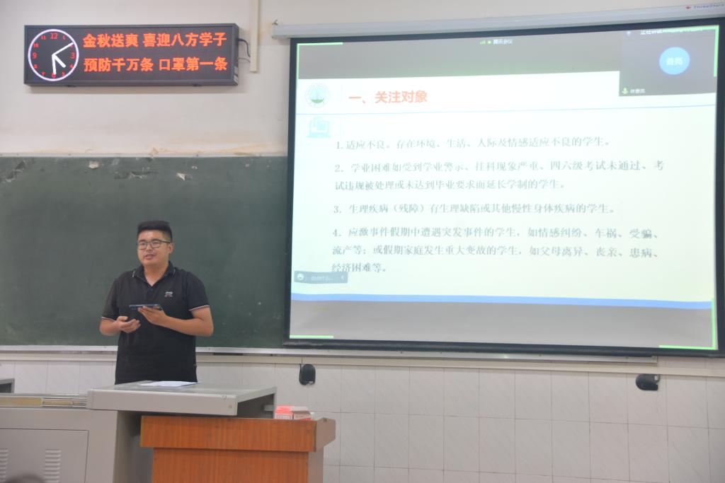 林香亮老师主要介绍了学生的心理健康安全问题和种子画、心理健康建设月等特色活动。在日常生活中学生干部和同学们生活在一起,更能第一时间发现同学遇到的困难,林老师强调学生干部一定要有关心同学的意识,遇到情况要第一时间上报老师,老师会采取最正确的方式应对。“希望学生干部平时能全力为辅导员分忧,一起守护正规滚球app平台官网学生的心理健康。”林老师对参会人员提出要求。