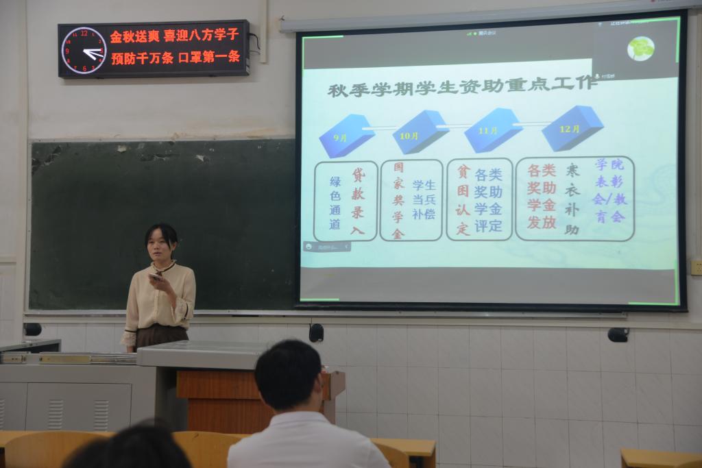 学生工作的第一要义是有方向的奔跑,会议上老师们对自己分管的工作进行了大致介绍。付雪娇老师就宿舍管理工作、奖助学金方面进行讲解。学院每年都会举办寝室文化建设月,付老师鼓励大家奋力打造校内文明寝室单位;学校和社会有许多奖助学金,希望大家努力学习,为自己和学院增光添彩。