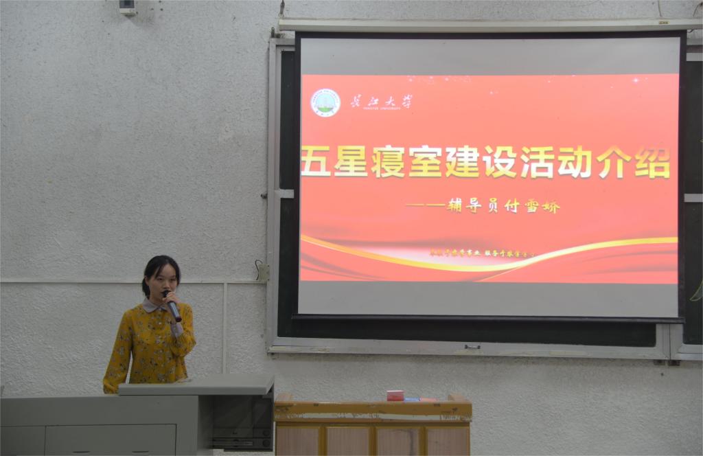 首先,宿委会层长江雪为大家对宿委会的工作进行讲解。随后,付老师就五星寝室建设活动,详细介绍了五星寝室的评比标准,并对卫生星、文明星、文化星、纪律星、学习星一一展开介绍,同时希望各寝室积极参加评比。