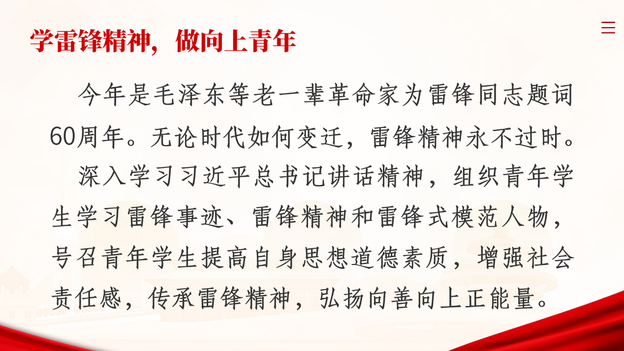 习近平总书记强调,雷锋同志身上所具有的信念的能量、大爱的胸怀、忘我的精神、进取的锐气,是我们民族精神的最好写照。新征程上,我们要深刻把握雷锋精神的时代内涵,更好发挥党员、干部模范带头作用,加强志愿服务保障和支持,为全面建设社会主义现代化国家、全面推进中华民族伟大复兴凝聚强大力量。