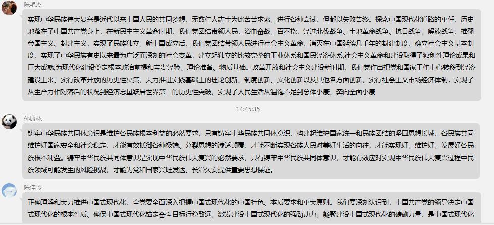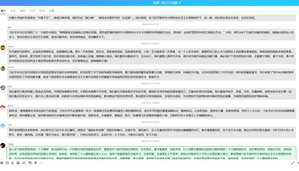 在集体讨论过程中,各团支部成员踊跃讨论交流自己的想法与收获。农研2104团支部贾艺泉表示:认真学习两会精神,争做有理想青年,我们不但要树牢正确的人生观、世界观、价值观,更要有自己的志向、追求、目标和理想,并坚持为之奋斗。农研2202团支部毛阿璐说道:“我们应珍惜今日来之不易的幸福生活,提高政治素养,紧密团结在以习近平同志为核心的党中央周围,为祖国繁荣富强更加努力学习,为中华民族伟大复兴奋斗终身!”