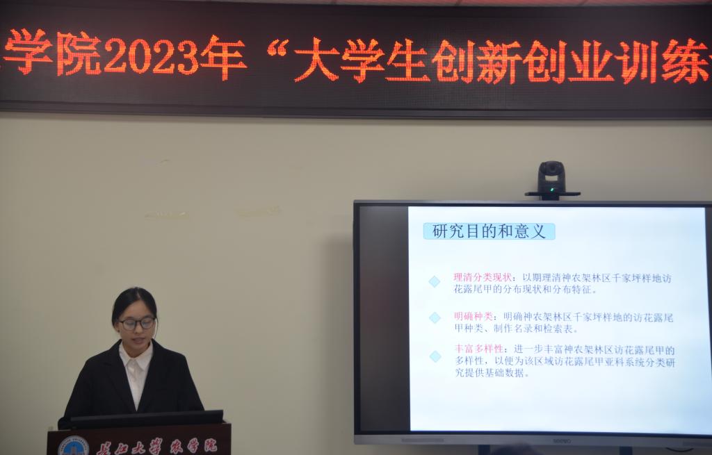 在答辩过程中,植保卓32201班的谭舒予同学的表现十分突出,在项目负责人陈傲的带领下,他们团队以神农架千家坪样地对访花露尾甲的分类为大学生创新创业项目进行了答辩。评委老师对她的答辩表达了一致的赞扬,并鼓励她在今后的学习中要围绕这个项目而努力,同时也倡导在场同学积极参与到科研工作中去。答辩过程中答辩者严谨的思路,流利的应答,彰显出创新创业的独特魅力;老师们结合经验,联系实际,给予鼓励的同时也提出宝贵建议,整场答辩过程精彩纷呈。