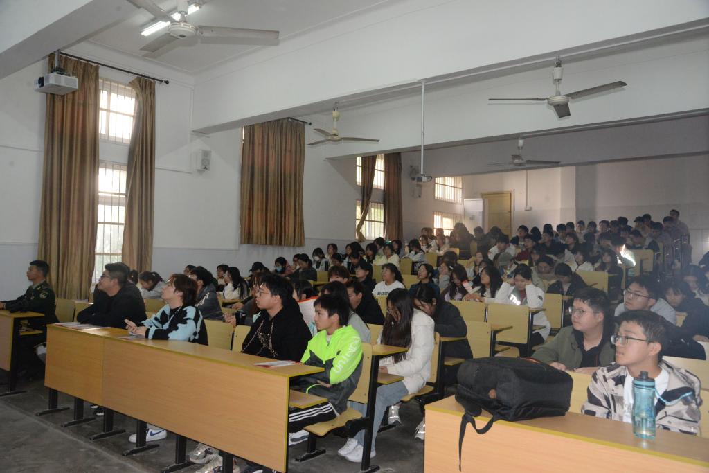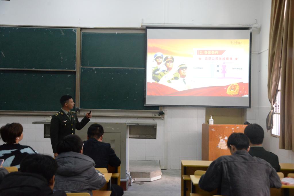征兵宣讲员刘金城向同学们详细介绍并分析了大学生参军入伍的报名应征程序、入伍保障、部队发展、退役安置等相关政策,帮助同学们更直观、更全面、更细致地了解征兵入伍工作,并对同学们的提问进行了一一解答。