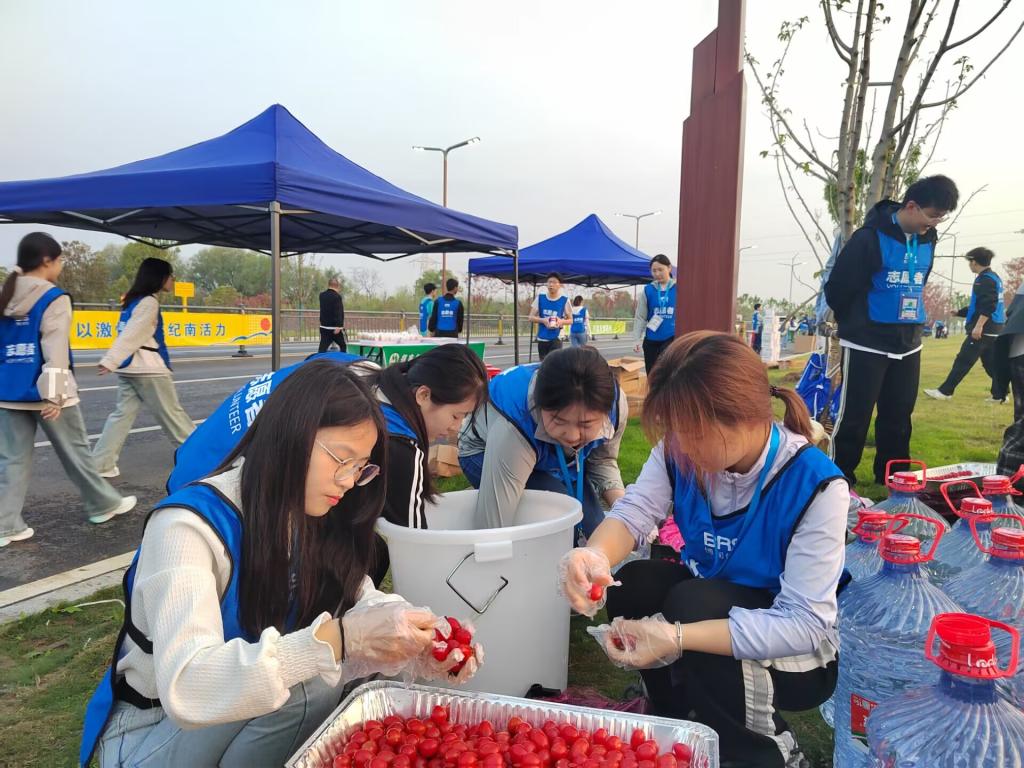 3月31日凌晨四点,志愿者们集结出发,乘车前往各自工作区域,他们追光而遇,沐光而行,有序进入工作模式。在比赛期间,正规滚球app平台官网的部分志愿者们在饮料水站提醒选手及时补充水分,防止选手在比赛过程中出现脱水现象,导致出现头晕、头痛、运动型中暑等症状。他们分工明确,一人摆放杯子,一人整理,一人倒水,为防止比赛中选手取水打翻杯子,他们合理调整每个水杯之间的间隙。在高峰期时,他们配合默契,井然有序地保障着赛事饮水的供给。还有一部分志愿者为营造良好的比赛环境,不影响参赛选手的成绩,在各个点位收集参赛者散落的随身物品。