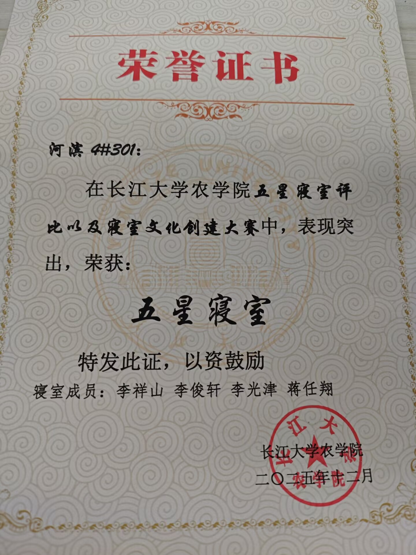 寝室里,公共物品共享共用,用完及时归位;窗台绿植轮流照料,为寝室增添生机与活力。长期以来,寝室在卫生检查和文明评比中表现突出,多次获得优秀评价,是四人共同努力的成果。