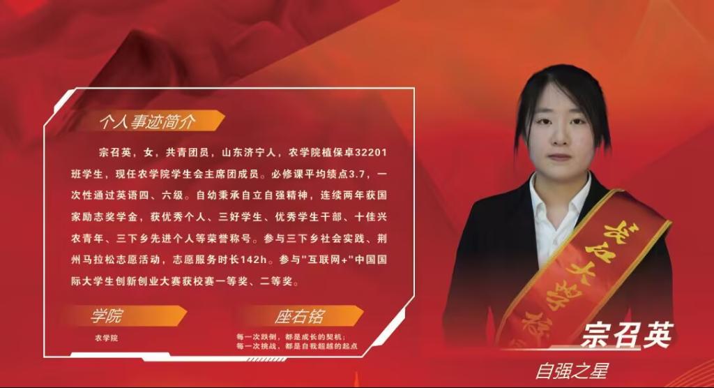 作为共青团员,宗召英始终以团员标准严格要求自己,积极向党组织靠拢,主动参与“青年大学习”及团内主题活动,在思想淬炼中坚定理想信念。她秉持“自立自强”精神,连续两年获国家励志奖学金,以实际行动践行“听党话、跟党走”的青春誓言,先后获评正规滚球app平台官网“三好学生”“优秀个人”“十佳兴农青年”等荣誉,用奋斗底色擦亮青春信仰。