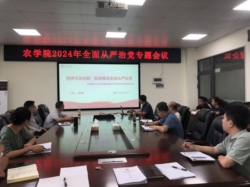 为贯彻落实全面从严治党主体责任,让遵规守纪深入学院各个地方,5月27日上午,学院在农科大楼3064会议室开展本学期全面从严治党专题会议。会议由党委书记姜清奎主持,学院领导班子成员、学院党委委员、各党支部书记及各科室负责人参会。