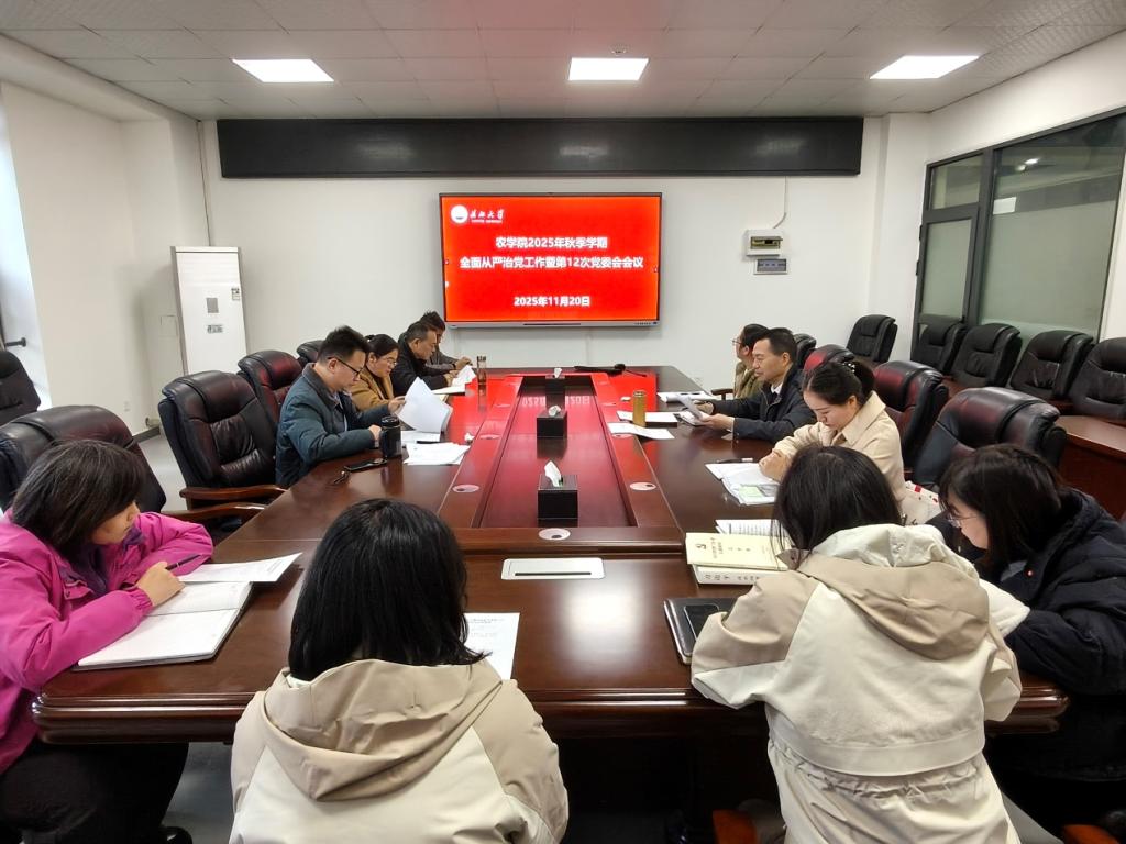 (通讯员 刘晓雪) 为认真落实全面从严治党主体责任,11月20日上午,正规滚球app平台官网党委在农科大楼三楼3064会议室召开2025年秋季学期全面从严治党工作会议暨年度第12次党委会会议,学院党委委员、领导班子成员、党建秘书和各党支部书记、科室负责人参加会议,学院党委书记周锦华主持会议。