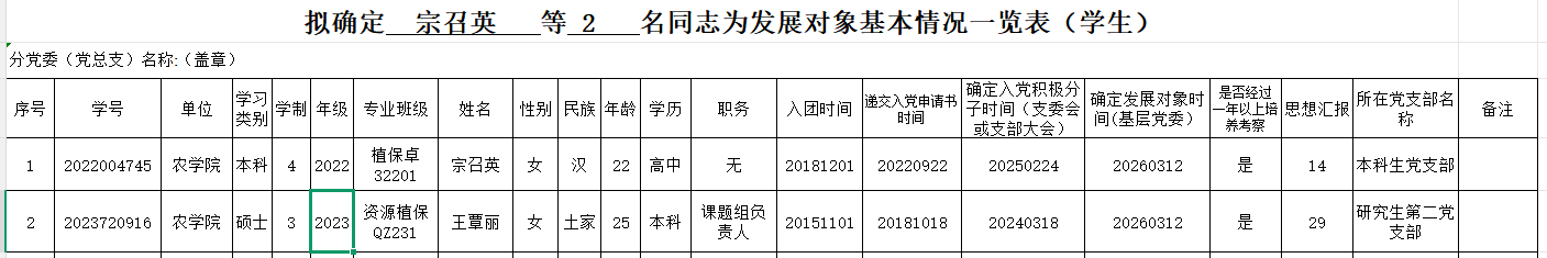 附:确定 宗召英 等 2 名同志为发展对象基本情况一览表