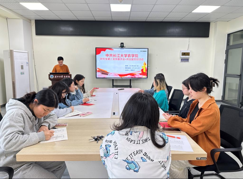 (通讯员 宋梦圆)2024年4月19日,滚球app官网研究生第二党支部在农科大楼3071开展四月份主题党日活动,活动结合腾讯会议(ID:875 482 695)的方式同时在线上召开。全体在校党员和校外联培党员共同参与,活动由韩晓文同志主持。