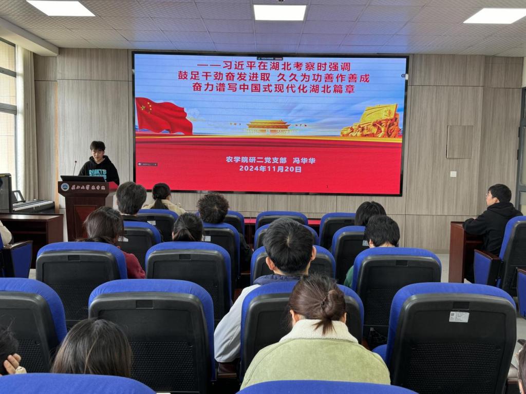 随后,党员冯华华、姜心清、甘娟、黄天宇同志聚焦习近平总书记考察湖北时的重要讲话与指示批示精神,紧密联系自身学习与工作实际,深入交流学习感悟。冯华华同志分享时提出,农学专业研究生应把专业知识与实践相融合,为乡村振兴添砖加瓦;姜心清同志则着重指出,新时代青年理当彰显新担当、展现新作为,积极推动高质量发展迈向新台阶。