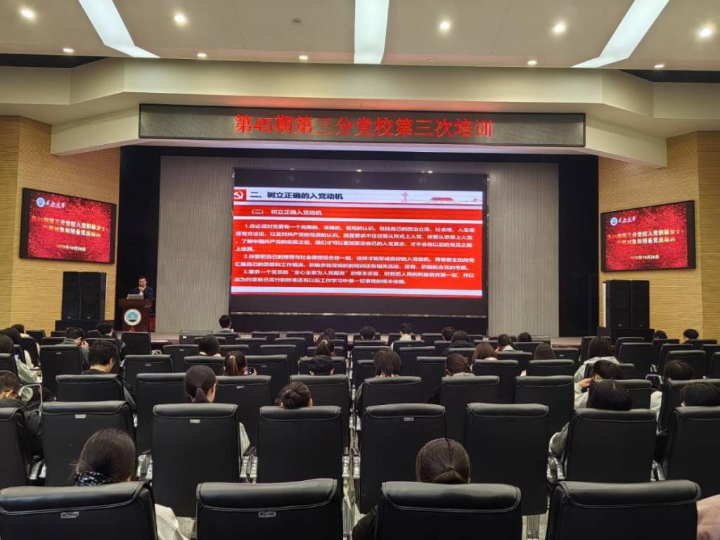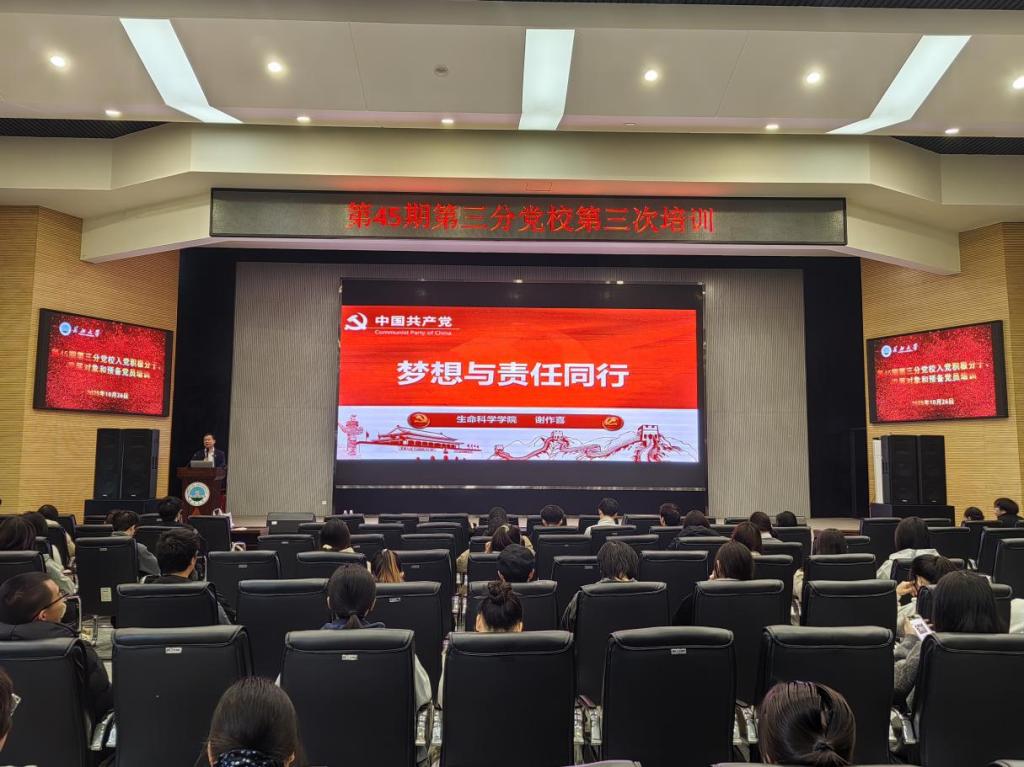 (通讯员 方学斌 严树彬/文 王浩源 王思雨 郑怡乐/摄)百年党史映初心,青春建功正当时。为深入学习贯彻党的二十大精神,引导青年学员从党的百年奋斗历程中汲取信仰力量、砥砺使命担当,10 月 26 日下午 2 点 30 分,正规滚球app平台官网在农科大楼 1058 报告厅如期开展第 45 期第三分党校第三次培训。本次培训以“梦想与责任同行”为主题,特邀生命科学学院党委书记谢作喜主讲,生命科学学院辅导员李敏和第三分党校全体入党积极分子、发展对象和预备党员参加,辅导员唐玉婷主持。