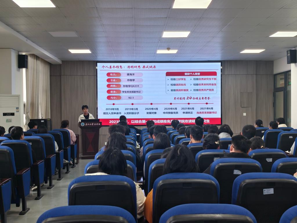 (通讯员 郑怡乐/文 郝梨/摄)党建领航研途路,先锋传薪启新程。为深入学习贯彻党的二十大精神,夯实研究生党支部战斗堡垒作用,11月12日中午,正规滚球app平台官网举行“一院一品”研究生党员学术经验分享活动。特邀学院3名研究生国家奖学金获得者:唐海洋、文泳、赵希梅作为主讲人为全体研究生党员和入党积极分子分享学术经验。
