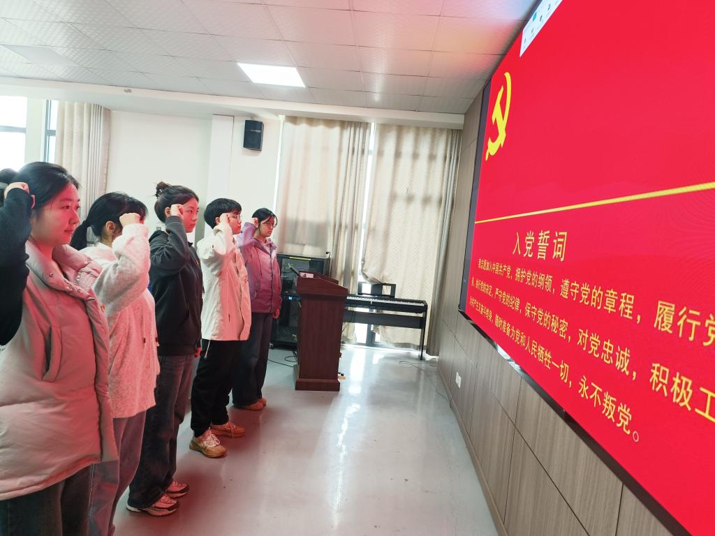第三项,与会正式党员进行无记名投票表决,经统计,支部党员一致同意接收任飞越等5名发展对象为中共预备党员。第四项,入党介绍人为预备党员佩戴党员徽章,全体党员在组织委员阳甜同志的带领下面向党旗,庄严宣誓。